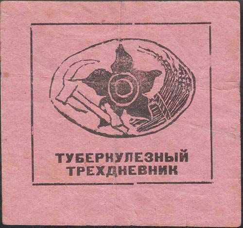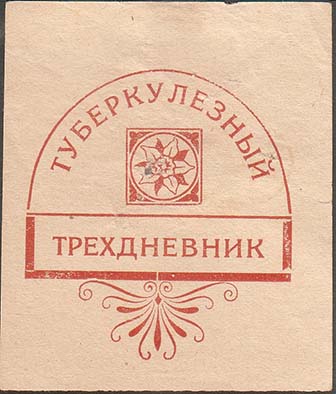 1930 1930(?) г. Разм. 42 х 48 мм. Одноцветная печать на серо-розовой бумаге. В центре в прямоугольной рамке разм. 39 х 45 мм в центре дополнительная ромбовидная рамка. В ромбовидной рамке медицинское обозначение туберкулеза – латинские буквы «T.bc.». Ниже текст в четыре строки: «Туберк[улезный]. 3-х дневник». По внутреннему периметру наружной рамки текст: «Туберкулез болезнь пролетарская».