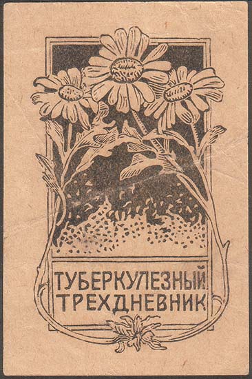1925 1925(?) г. Разм. рамки 60 х 90 мм. Одноцветная печать бумаге различных цветов. В прямоугольной рамке разм. 40 х 70 мм сверху три цветка ромашки со стеблями, пересекающими рамку в нижней части и соединяющимися внизу под рамкой. Внизу в рамке текст в две строки: «Туберкулезный трехдневник».