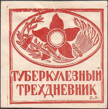 1926 1926(?) г. Разм. рамки 55 х 55 мм. Одноцветная печать на белой бумаге. Сверху в двойной овальной рамке цветок мака в обрамлении снопа серпа и молота и оливковой ветви. Внизу текст в две строки: «Туберкулезный трехдневник». В правом нижнем углу буквы «Д.Л.».