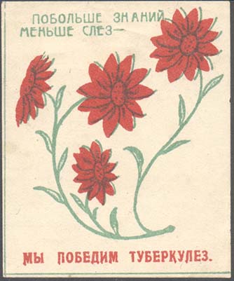 1928 1928(?) г. Разм. 60 х 70 мм. Двухцветная печать на белой бумаге. В тонкой прямоугольной рамке разм. 56 х 67 мм ветка с четырьмя цветками. Сверху текст в две строки: «Больше знаний меньше слез -». Внизу продолжение текста: «Мы победим туберкулез».