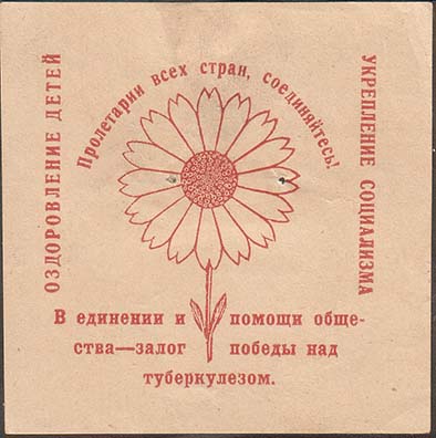 1930 1930(?) г. Разм. 65 х 65 мм. Одноцветная печать на белой бумаге. В центре стилизованное изображение цветка ромашки. Сверху полукругом текст: «Пролетарии всех стран, соединяйтесь!». Слева и справа вертикально текст: «Оздоровление детей укрепление социализма». Внизу текст в три строки: «В единении и помощи общества – залог победы над туберкулезом».