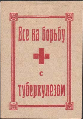 1930 1930(?) г. Разм. рамки 34 х 51 мм. Одноцветная печать на белой бумаге. В прямоугольной рамке с декоративными элементами по углам в центре красный крест. Текст в три строки: «Все на борьбу с туберкулезом».