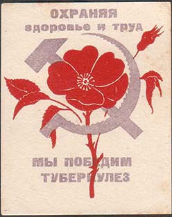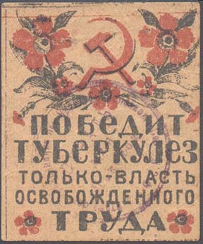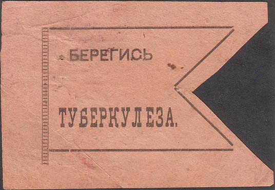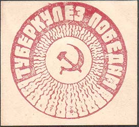 1930 1930(?) г. Разм. 48 х 58 мм. Двухцветная печать на тол-стой рыхлой желтоватой бумаге. Сверху серп и молот в обрамлении венка из цветов мака. Внизу текст в пять строк: «Победит туберкулез только власть освобожденного труда». Внизу по углам цветы мака. Внизу мелким шрифтом выходные данные неразборчиво. На лицевой стороне фиолетовый оттиск круглой печати с неразборчивым текстом.