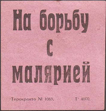 1930 1930(?) г. Разм. 58 х 62 мм. Одноцветная печать на розовой гладкой бумаге. В центре текст в три строки: «На борьбу с малярией». Внизу мелким шрифтом выходные данные: «Терокрлито №1083 т. 4000».