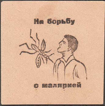 1930 1930(?) г. Разм. 67 х 67 мм. Одноцветная печать на светло-желто-оранжевой бумаге. В центре комар и человек. Текст в две строки: «На борьбу с малярией».