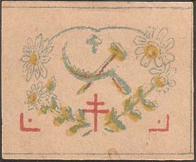 1930 1930(?) г. Разм. 48 х 38 мм. Трехцветная печать на плотной кремовой бумаге. В тонкой прямоугольной рамке разм. 46 х 34,5 мм в центре шестиконечный крест и серп и молот в обрамлении венка из ромашек.