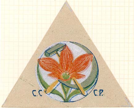 1930 1930(?) г. Треугольник разм. 74 х 59 мм. Многоцветная печать на сероватой бумаге. В центре в круглой рамке диаметром 34 мм стилизованное изображение цветка мака и скрещенные серп и молот. Внизу под рамкой аббревиатура «С.С.С.Р.».