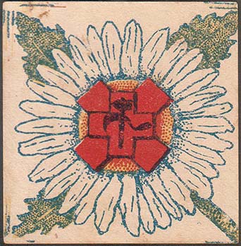 1930 1930(?) г. Разм. 57 х 57 мм. Многоцветная печать на белой бумаге. В центре цветок ромашки с тремя листьями и стеблем. В центре цветка два красных креста и серп и молот.