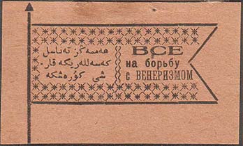 1930 1930(?) г. Разм. 58 х 34 мм. Одноцветная печать на коричневой бумаге. В центре в рамке сложной формы в Виле флажка на фоне из декоративных элементов справа текст в три строки: «Все на борьбу с венеризмом». Слева текст в три строки на местном языке арабским шрифтом.