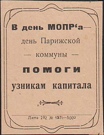 1930 1930(?) г. Разм. рамки 53 х 72 мм. Одноцветная печать на желтоватой бумаге. В двойной декоративной рамке сложной формы текст в пять строк: «В день МОПРа – день Парижской коммуны помоги узникам капитала». Ниже декоративный элемент. Внизу под чертой выходные данные мелким шрифтом: «Лито 192 №1571 - 5000».