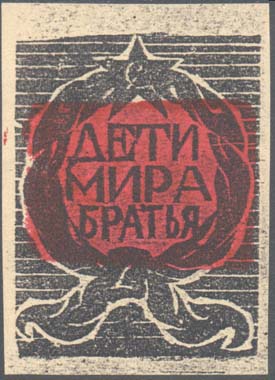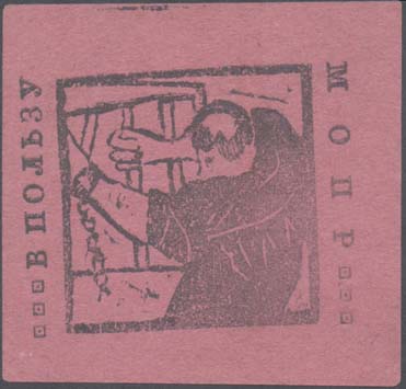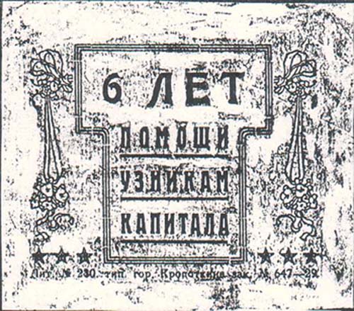 1928 1928(?) г. Разм. 87 x 75 мм. Одноцветная печать на тон-кой светло-оранжевой бумаге. В центре в тройной рамке сложной формы разм. 48,5 х 53 мм текст в четыре строки: «6 лет помощи узникам капитала». По бокам декоративные элементы. Внизу выходные данные мелким шрифтом: «Лит. № 230. тип. гор. Кропоткина. Зак. № 647-29».