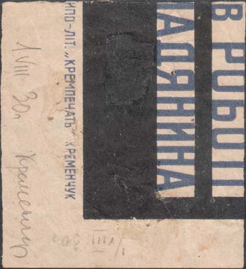 1932 1932 г. Разм. 54 х 54 мм. Трехцветная печать на серо-голубоватой бумаге. В рамке из концентрических окружностей диаметром 39 мм в центре эмблема МОПР. Между рамками по окружности текст: «Криворожская организация. Да здравствует интернационально-классовая солидарность трудящихся». По периметру текст на украинском языке: «В ответ на зверства белого террора – усилим помощь борцам революции». В углах номинал. Внизу выходные данные мелким шрифтом неразборчиво.