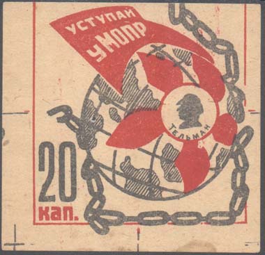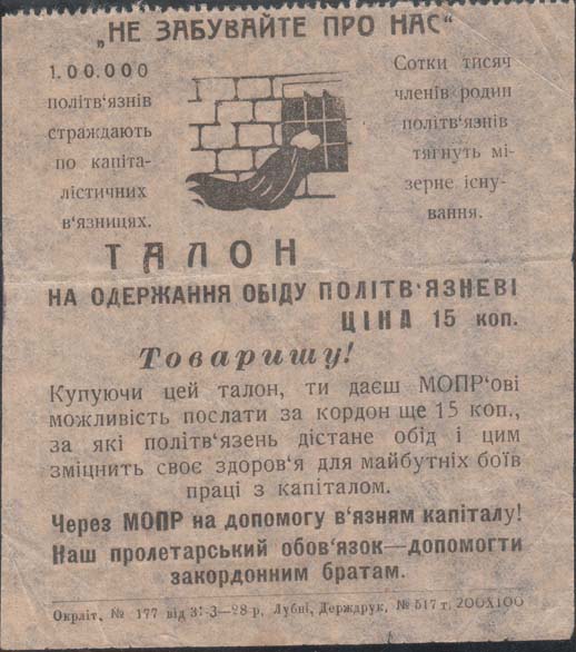 1928 1928 г. 31.03.1928 г. Листок из квитанционной книжки разм. 87 x 97. Одноцветная печать на тонкой серой бумаге. Сверху зубц. 11 1/2. В центре текст в двенадцать строк украинском языке: «Талон на приобретение обеда политзаключенному. Цена 15 коп. Товарищ! Покупая этот талон ты даешь МОПРу возможность послать за границу еще 15 коп. на которые политзаключенный приобретет себе обед, и тем самым укрепит свое здоровье для будущей борьбы с капиталом. Через МОПР на помощь узникам капитала! Наш пролетарский долг – помочь зарубежным братьям». Сверху эмблема МОПР. В левом верхнем углу текст в шесть строк на украинском языке: «100000 политзаключенных страдают по капиталистическим тюрьмам». В правом верхнем углу текст в шесть строк на украинском языке: «Сотни тысяч членов семей политзаключенных влачат свое жалкое существование». Внизу мелким шрифтом выходные данные на украинском языке: «Окрлит. № 177 от 31-3 28 г. Лубны. Гостип. N 517. т. 200x100».