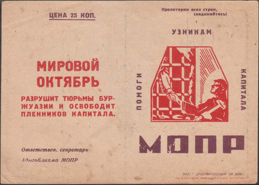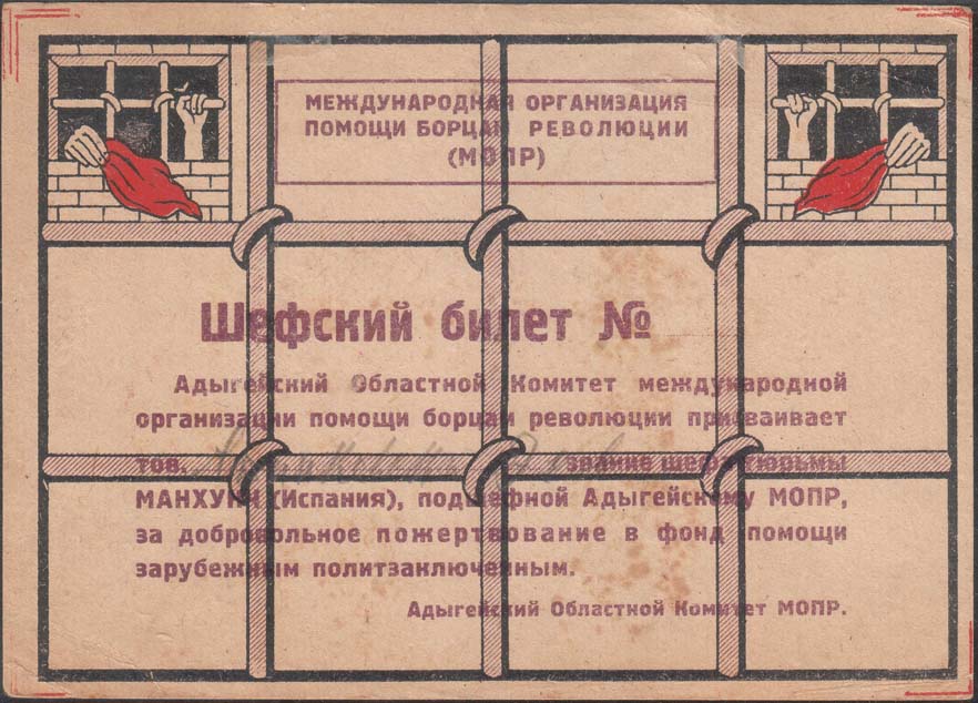 1929 1929 г. Листок разм. 148 х 105 мм. Трехцветная двухсторонняя печать на толстой желтоватой бумаге. На лицевой стороне слева в центре текст в пять строк: «Мировой октябрь разрушит тюрьмы буржуазии и освободит пленников капитала». Сверху текст: «Цена 25 коп.». Внизу текст в две строки: «Ответствен[ный]. Секретарь Адыгоблкома МОПР». Справа эмблема МОПР с текстом по периметру: «Помоги узникам капитала. МОПР». Сверху текст в две строки: «Пролетарии всех стран, соединяйтесь!». Внизу текст в две строки мелким шрифтом: «Билет действителен на 1930 г. Лит. С.К.П. Треста Краснодар. Т. 1000 ... (далее неразборчиво)». На оборотной стороне на фоне тюремной решетки в центре текст в восемь строк: «Адыгейский Областной Комитет международной организации помощи борцам революции присваивает тов. ... звание шефа тюрьмы Манхунн (Испания), подшефной Адыгейскому МОПР, за добровольное пожертвование в фонд помощи зарубежным политзаключенным. Адыгейский Областной Комитет МОПР». Сверху по углам эмблемы МОПР. Сверху в центре в прямоугольной рамке текст в три строки: «Международная организация помощи борцам революции (МОПР)». По углам знака разграничительные линии.