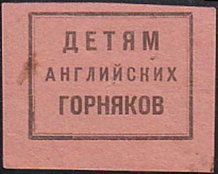 1926 1926 г. Разм. 51 х 40 мм. Одноцветная печать на розово-серой бумаге. В центре в двойной прямоугольной рамке разм. 39 х 40 мм текст в три строки: «Детям английских горняков».