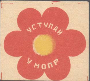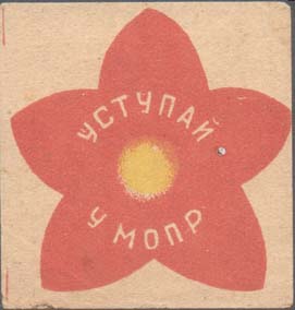 1930 1930(?) г. 47 х 50 мм. Двухцветная печать на желтоватой бумаге. В центре цветок c различным количеством лепестков. Текст на белорусском языке в две строки: «Вступай в МОПР». По углам знака разграничительные линии.
