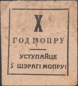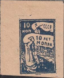 1932 1932 г. Разм. 42 х 47 мм. Одноцветная печать на рыхлой желтоватой бумаге. В двойной прямоугольной рамке разм. 33 х 36 мм сверху текст в две строки на белорусском языке: «X лет МОПРу». В центре горизонтальная черта. Внизу текст в две строки на белорусском языке: «Вступайте в кружки МОПРа!».