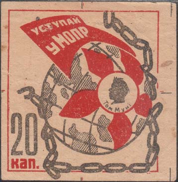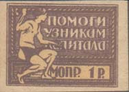 1924 1924 г. Всесоюзный выпуск. Разм. рамки 27,5 х 20 мм. Двухцветная печать на кремовой бумаге. С просечкой и Б.З. В центре в прямоугольной рамке рабочий выбивает на стене молотком и зубилом текст в три строки: «Помоги узникам капитала». Внизу аббревиатура «МОПР» и номинал.