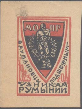 1923 1923 г. Разм. 44 х 58 мм. Двухцветная печать на желтоватой бумаге. В центре в прямоугольной рамке разм. 30 х 44 мм треугольный щиток, на котором заключенный и аббревиатура «МОПР». Внизу по наружной рамке щитка текст: «Баумановцы подшефным». Внизу продолжение текста в две строки: «Узникам Румынии». Слева и справа дата: «1923 год».