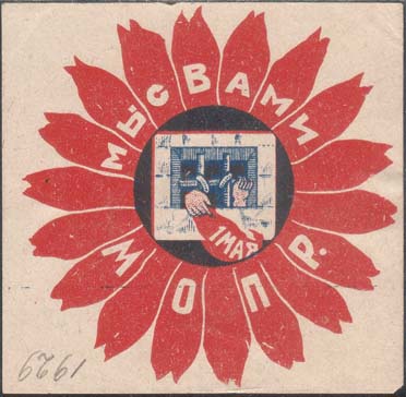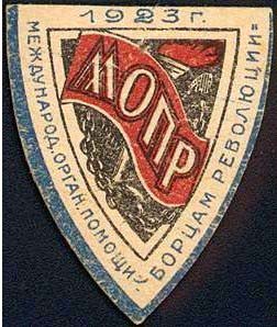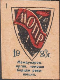 0 0 г. Разм. 34 х 45 мм. Трехцветная печать на плотном желтоватом картоне. В центре эмблема МОПР (ранний вариант). Внизу дата: «1923 г.» и текст в четыре строки: «Международ[ная]. орган[изация]. помощи борцам революции».