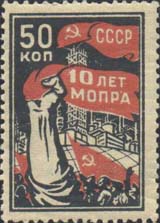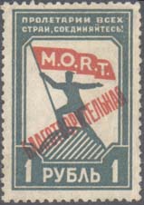 1924 1924 г. Всесоюзный выпуск. Разм. рамки 22,5 х 33,5 мм. Двухцветная печать на белой бумаге с В.З. «Ковер». Зубц. 12 х 11 3/4. С клеем. В центре в двойной прямоугольной рамке дополнительная фигурная рамка. В фигурной рамке рабочий со знаменем, стоящий на стилизованном земном шаре. На знамени аббревиатура «МОПР» на немецком языке. Сверху между рамками текст в две строки: «Пролетарии всех стран, соединяйтесь!». Внизу номинал. По диагонали текст: «Благотворительная».
