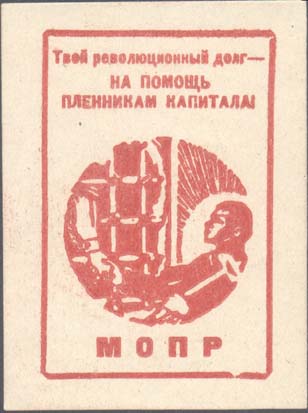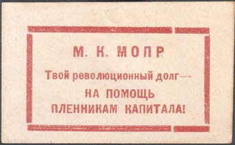1930 1930(?) г. Разм. 56 х 33 мм. Одноцветная печать на толстой белой бумаге. В прямоугольной рамке разм. 44 х 25 мм текст в четыре строки: «М.К. МОПР. Твой революционный долг на помощь пленникам капитала!».