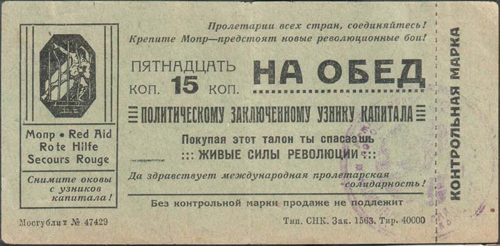 1929 1929(?) г. Листок разм. 121 х 60 мм. Одноцветная печать на плотной желто-зеленой бумаге. В центре текст в восемь строк: «Пролетарии всех стран, соединяйтесь! Крепите МОПР – предстоят новые революционные бои! Пятнадцать коп. Но обед политическому заключенному узнику капитала. Покупая этот талон ты спасаешь живые силы революции. Да здравствует международная пролетарская солидарность!». Слева в прямоугольной рамке эмблема МОПР. Внизу название организации на русском, английском, немецком и французском языках и текст в три строки: «Снимите оковы с узников капитала!». Справа вертикально пунктирная линия и текст вертикально снизу вверх: «Контрольная марка». Внизу выходные данные мелким шрифтом: «Мосгублит № 47729. Тип. СНК. Зак 1563. Тир. 40000». На лицевой стороне справа фиолетовый оттиск круглой контрольной печати.