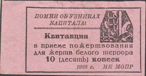 1928 1928 г. 01.05.1928 г. Разм. 80 х 46 мм. Одноцветная печать на бумаге различных цветов. В прямоугольной рамке разм. 62 х 34 мм в центре текст в пять строк: «Квитанция в приеме пожертвования для жертв белого террора ... копеек. 1929 г. МК МОПР». В правом верхнем углу эмблема МОПР. В левом верхнем углу текст в две строки: «Помни об узниках капитала!».