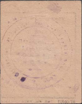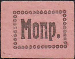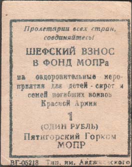 1930 1930(?) г. Разм. 40 х 55 мм. Одноцветная печать на плотной желтоватой бумаге. В прямоугольной рамке разм. 40 х 46 мм текст в двенадцать строк: «Пролетарии всех стран, соединяйтесь! Шефский взнос в фонд МОПРа. На оздоровительные мероприятия для детей-сирот семей погибших воинов Красной Армии. 1 (Один рубль). Пятигорский Горком МОПР». Внизу под рамкой мелким шрифтом выходные данные: «ВГ-05218. Тип. Им. Анджиевского». На оборотной стороне фиолетовый оттиск круглой контрольной печати диаметром 41 мм с неразборчивым текстом.