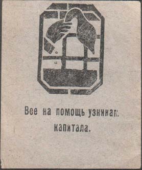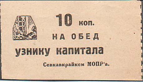1930 1930 г. Разм. 77 х 44 мм. Одноцветная печать на желтоватой бумаге. В центре текст в две строки: «На обед узнику капитала». Сверху номинал. Внизу текст: «Севкавкрайком МОПРа». В левом верхнем углу эмблема МОПР. По бокам знака вертикальные пунктирные разграничительные линии.