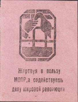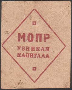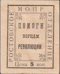 1926 1926(?) г. Разм 40 х 53 мм. Одноцветная печать на плотной кремовой бумаге. В двойной прямоугольной рамке в центре текст в три строки: «Помоги борцам революции». По периметру между рамками текст: «М.О.П.Р. Ростовское отделение. Цена 5 коп.».