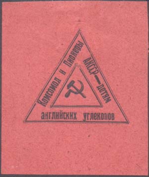 1926 1926 г. Разм. 50 х 60 мм. Одноцветная печать на плот-ной розово-красной бумаге. В центре в двойной треугольной рамке разм. 36 х 37 мм серп и молот. По периметру между рамками текст: «Комсомол и Пионеры АКССР – Детям английских углекопов».