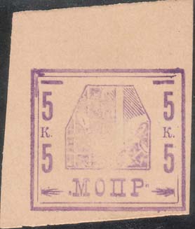 1930 1930 г. 01.11.1930 г. Разм. ≈ 36 х 34 мм. Одноцветная печать на желтоватой бумаге с мелованным верхним слоем. Фиолетовый оттиск штампа, в котором в двойной прямоугольной рамке разм. 30 х 27 мм в центре эмблема МОПР. Слева и справа вертикально номинал. Внизу аббревиатура: «МОПР».