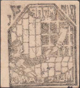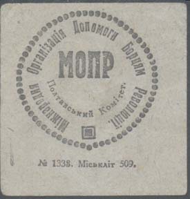 1931 1931 г. 07.11.1931 г. Разм. 46 х 48 мм. Одноцветная печать на серо-зеленой бумаге. В центре в круглой декоративной рамке диаметром 35 мм текст в две строки на украинском языке: «МОПР Полтавский Комитет». По внутреннему периметру рамки текст на украинском языке: «Международная Организация Помощи Борцам Революции». Внизу мелким шрифтом выходные данные на украинском языке: «№1338. Горлит 509».