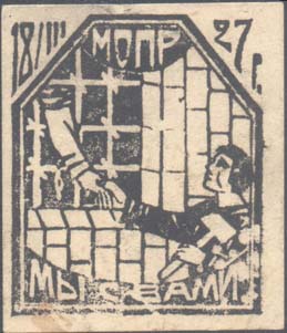 1927 1927 г. 18.03.1927 г. Разм. 43 х 50 мм. Одноцветная печать на бумаге различных цветов. В центре в двойной шестиугольной рамке разм. 38 х 46 мм эмблема МОПР: рабочий пожимает руку узнику через решетку». Сверху аббревиатура «МОПР». Внизу текст: «Мы с вами». Сверху дата: «18/III 27 г.».