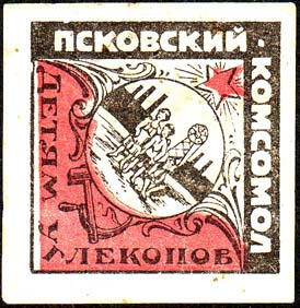 1926 1926 г. 08.08.1926 г. Ромб разм. рамки 55 х 55 мм. Одноцветная и двухцветная печать на плотной белой (оттенки) бумаге. В центре в круглой рамке женщина и двое детей на фоне угольной шахты. Сверху пятиконечная звезда с лучами. Внизу серп и молот. По внутреннему периметру таки текст: «Псковский комсомол детям углекопов».