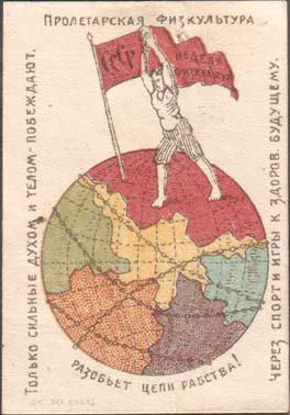 1924 1924 г. 06-07.09.1924 г. Разм. 44 х 63 мм. Многоцветная печать на толстой белой полуглянцевой бумаге. В центре аллегорический сюжет: земной шар в цепях на котором флаг с текстом: «СССР. Неделя физкультуры» и фигура спортсмена, разбивающего цепи. По периметру текст: «Только сильные духом и телом – побеждают. Пролетарская физкультура. Через спорт к здоров[ому]. будущему». Слева внизу выходные данные мелким шрифтом: «Псков. Набат».