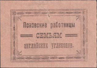 1926 1926 г. Разм. 52 х 37 мм. Одноцветная печать на розово-серой бумаге. В двойной прямоугольной рамке текст в три строки: «Псковские работницы семьям английских углекопов».