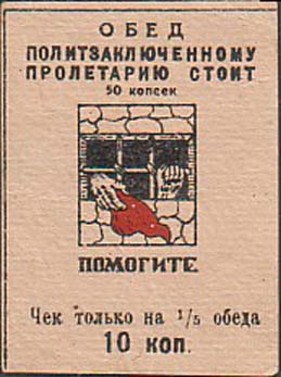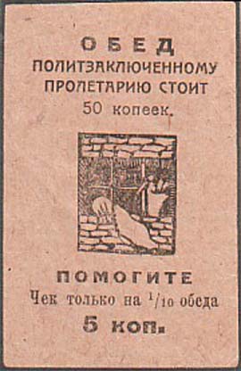 1929 1929 г. Разм. 44 х 69 мм. Одноцветная печать на желтоватой бумаге. В центре в прямоугольной рамке эмблема МОПР. Сверху текст в четыре строки: «Обед политзаключенному пролетарию стоит 50 копеек». Внизу текст в три строки: «Помогите. Чек только на 1/10 обеда 5 коп.».