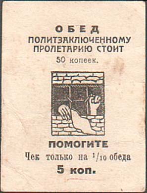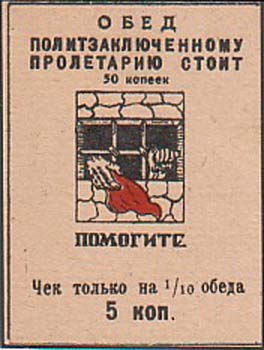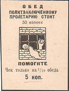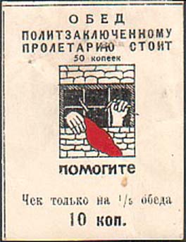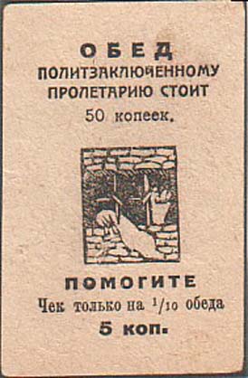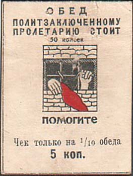 1929 1929 г. Разм. 44 х 58 мм. Двухцветная печать на желто-коричневой бумаге. В центре в прямоугольной рамке эмблема МОПР. Сверху текст в четыре строки: «Обед политзаключенному пролетарию стоит 50 копеек».