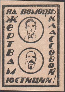 1927 1927 г. Сентябрь. Разм рамки 31 х 45 мм. Одноцветная печать на плотной кремовой бумаге. В прямоугольной рамке вертикально в круглых рамках портреты Н.Сакко и Б.Ванцетти. По периметру по внутренней стороне рамки текст: «На помощь жертвам классовой юстиции!».