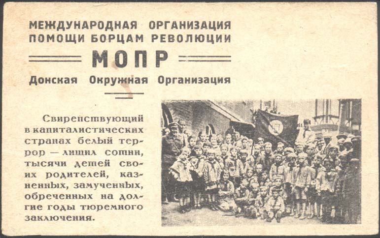 1930 1930(?) г. Листок разм. 129 х 80 мм. Одноцветная печать на желтоватой бумаге. В левом верхнем углу текст в четыре строки: «Международная организация помощи борцам революции МОПР Донская Окружная Организация». В правом нижнем углу группа детей с флагом. Слева текст в десять строк: «Свирепствующий в капиталистических странах белый террор – лишил сотни, тысячи детей своих родителей, казненных, замученных, обреченных на долгие годы тюремного заключения».