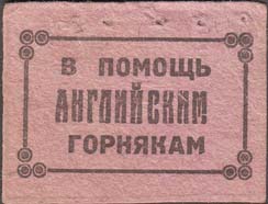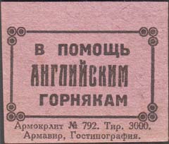 1926 1926 г. Разм. 40 х 34 мм. Одноцветная печать на бумаге различных цветов. В прямоугольной рамке с декоративными элементами по углам в центре текст в три строки: «В помощь английским горнякам».