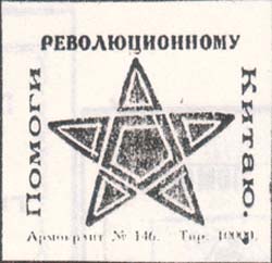 1926 1926(?) г. Разм. 43 x 42 мм. Одноцветная печать на толстой белой бумаге. В центре пятиконечная звезда из декоративных элементов. По периметру текст: «Помоги революционному Китаю». Внизу выходные данные мелким шрифтом: «Армокрлит. № 146. Тир. 10000».
