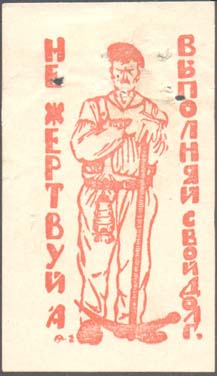1926 1926 г. 01.-03.11.1926 г. Разм. 36 х 62 мм. Одноцветная печать на белой плотной глянцевой бумаге. В центре шахтер, опирающийся на кирку. Слева и справа вертикально текст: «Не жертвуй, а выполняй свой долг».