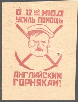 1926 1926 г. 01.-03.11.1926 г. Разм. 42 х 56 мм. Одноцветная печать на желто-серой бумаге. В центре скрещенные кирки и голова шахтера в кепке. Сверху текст в две строки: «В 12–ый МЮД. Усиль помощь». Внизу продолжение текста в две строки: «Английским горнякам!».