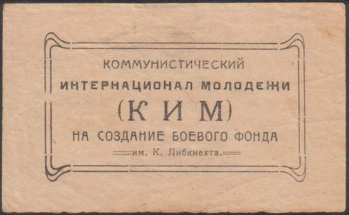 1930 1930(?) г. Разм. 82 х 50 мм. Одноцветная печать на тонкой желтоватой бумаге. В двойной прямоугольной декоративной рамке разм. 62 х 31 мм в центре текст в пять строк: «Коммунистический интернационал молодежи (КИМ) на создание боевого фонда им. К.Либкнехта».
