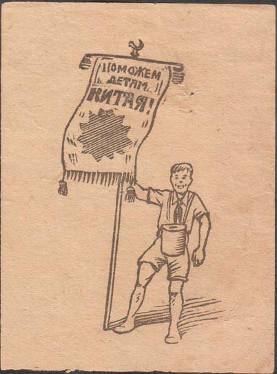 1926 1926 г. Разм. 67 х 90 мм. Одноцветная печать на плотной бумаге различных цветов. В центре пионер с емкостью для сбора пожертвований на груди. В правой руке держит флаг с многолучевой звездой и текстом в три строки: «Поможем детям Китая!».
