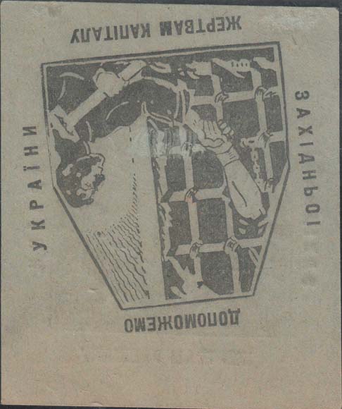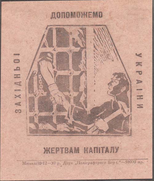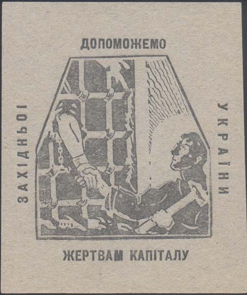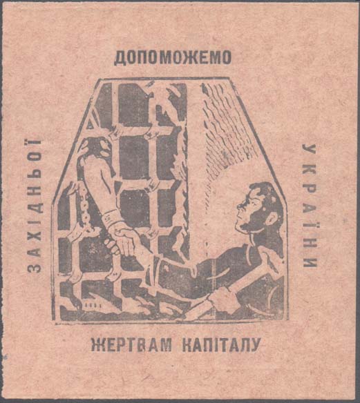1930 1930 г. 10.12.1930 г. Разм. ≈ 87 х 97 мм. Одноцветная печать на бумаге различных цветов. В центре эмблема МОПР. По периметру текст на украинском языке: «Поможем жертвам капитала Западной Украины». Внизу выходные данные мелким шрифтом на украинском языке: «Горлит 10-12–30 г. Тип. «Полиграфтрест Берд.» - 50000 экз.».