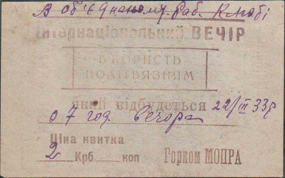 1933 1933 г. 22.03.1933 г. Разм. 96 х 60 мм. Одноцветная печать на серо-зеленой бумаге. В центре в прямоугольной рамке текст в две строки на украинском языке: «В пользу политзаключенных». Сверху текст в две строки на украинском языке: «... Интернациональный вечер». Внизу продолжение текста в четыре строки на украинском языке: «Который состоится ... Цена талона ... руб. ... коп. Горком МОПРа».